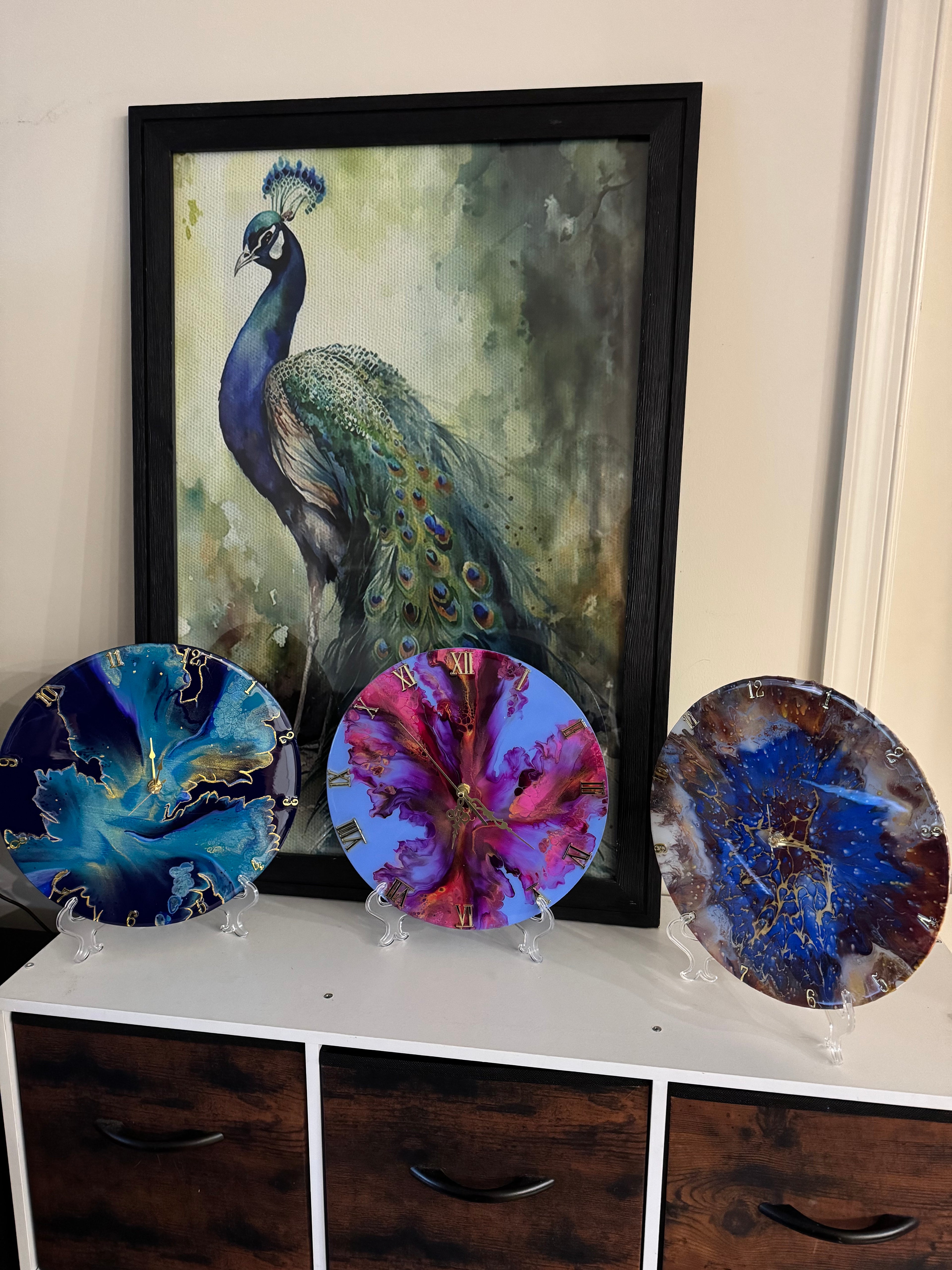 A Collection of original wood wall clocks, each created using the Dutch Pour and Shelee Art fluid painting techniques. Finished with a high/gloss resin coat, these pieces merge contemporary artistry with functional design.